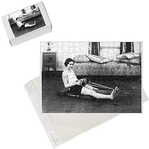 Photo Jigsaw, EXERCISE MACHINE. This wise young woman is toning up and slimming down with the aid of a new fangled rowing exercise machine! . Chosen by Mary Evans. Bespoke 300 Piece Jigsaw Puzzle 17x12 (43x30cm). The jigsaw is delivered bagged and on a back board making a superb gift. Also supplied are a re-sealable bag, a photo example of the image and a self assemble flat packed box for storage. This item is shipped from our UK lab.